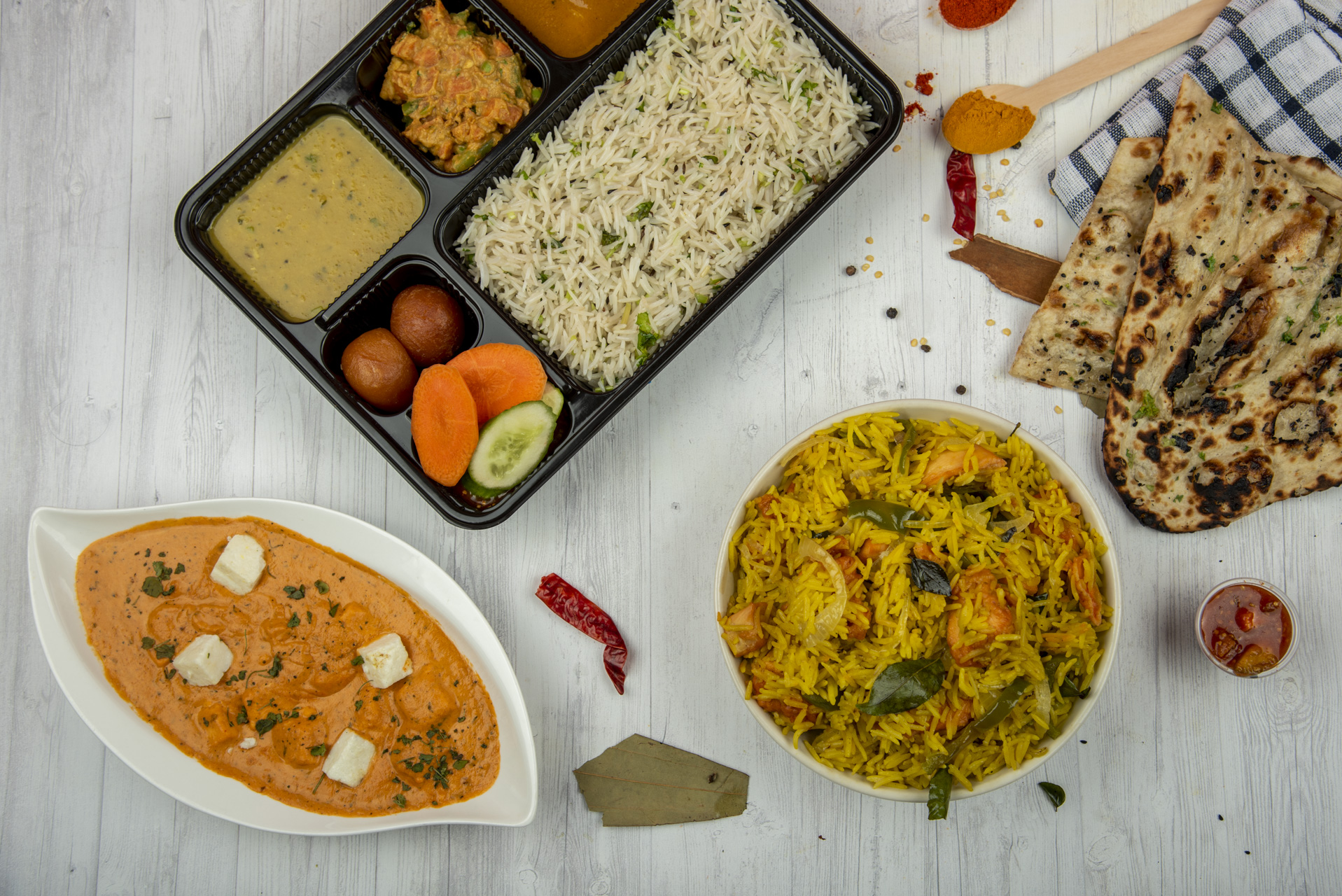 Non Veg Thali: Non Veg Gravy, Daal/Veg, 2 Chapatis, Rice, Pickle, Salad and Curd