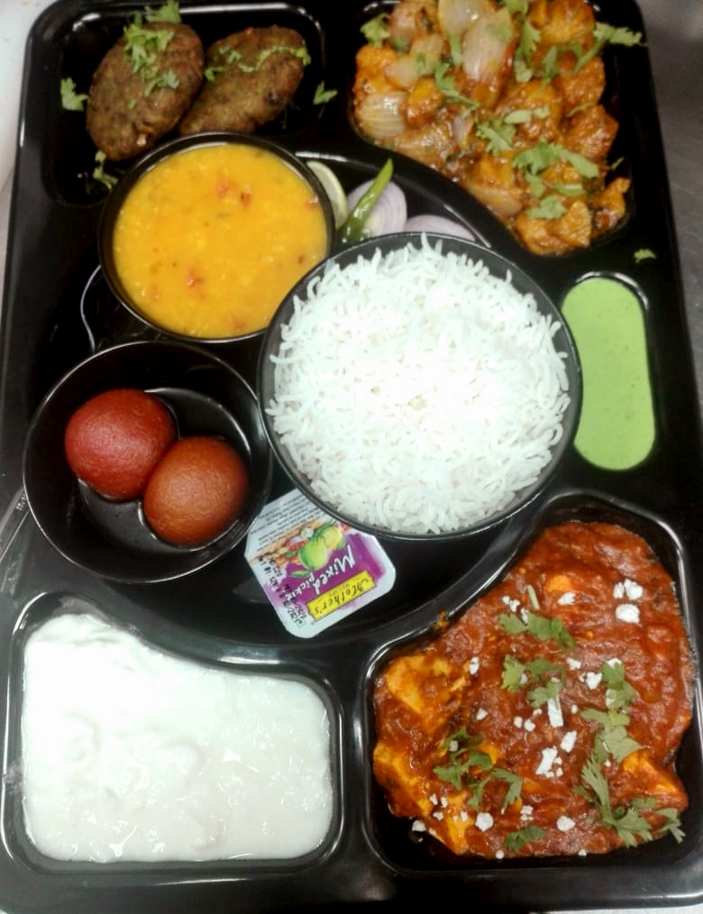 Full Thali: 2 Subji, 3 Chapattis, Dal, Rice, Papad, Sweet & Buttermilk.